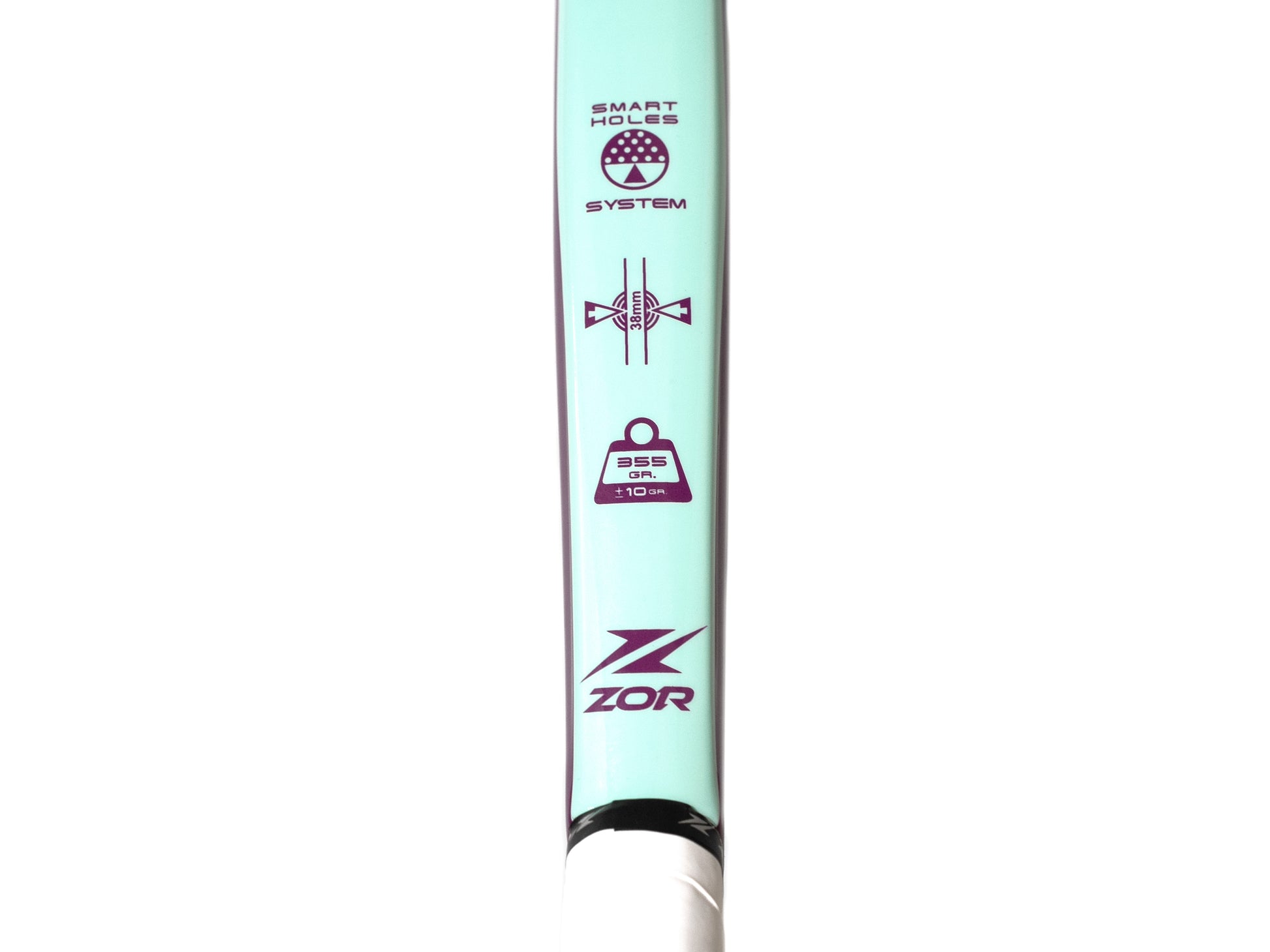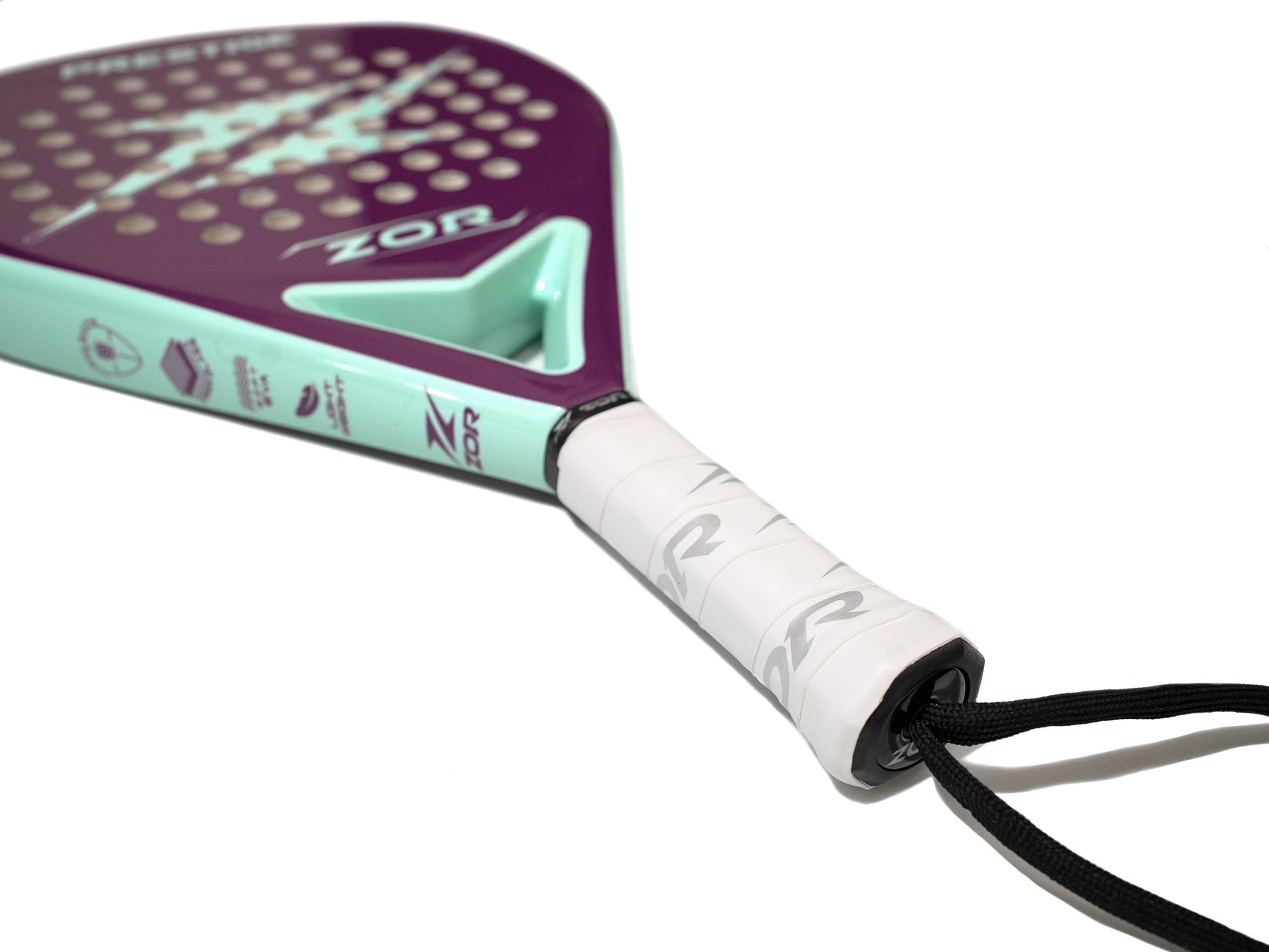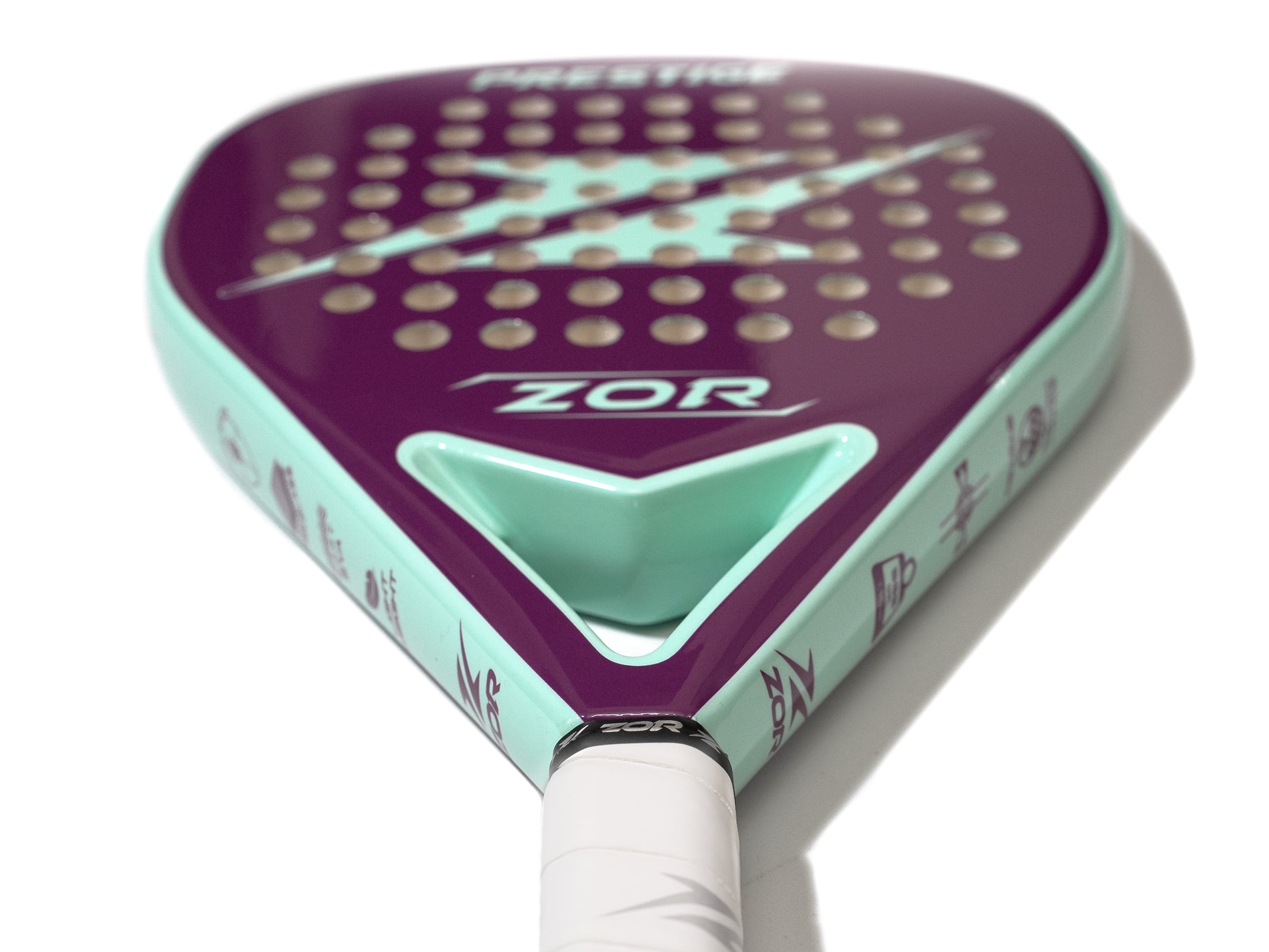 The ZOR Prestige padel racket for women features a hybrid shape with an elevated sweet spot for added power without compromising control. Its fiberglass frame and Soft EVA core provide comfort and precision, while the Smart Holes System enhances spin and accuracy. Lightweight and adaptable, this racket is perfect for players refining their skills.
